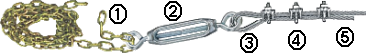 Secure the chain (1) or eyebolt around the tree or structure and through the turnbuckle (2). Slip the thimble (3) through the other end of the turnbuckle and run the cable around the thimble. Pull 20" to 30" of cable through the thimble to allow enough slack to clamp (5). Attach three cable clamps (4) with the bolt side of the clamp on the long end of the cable and the "U" side on the cut end.